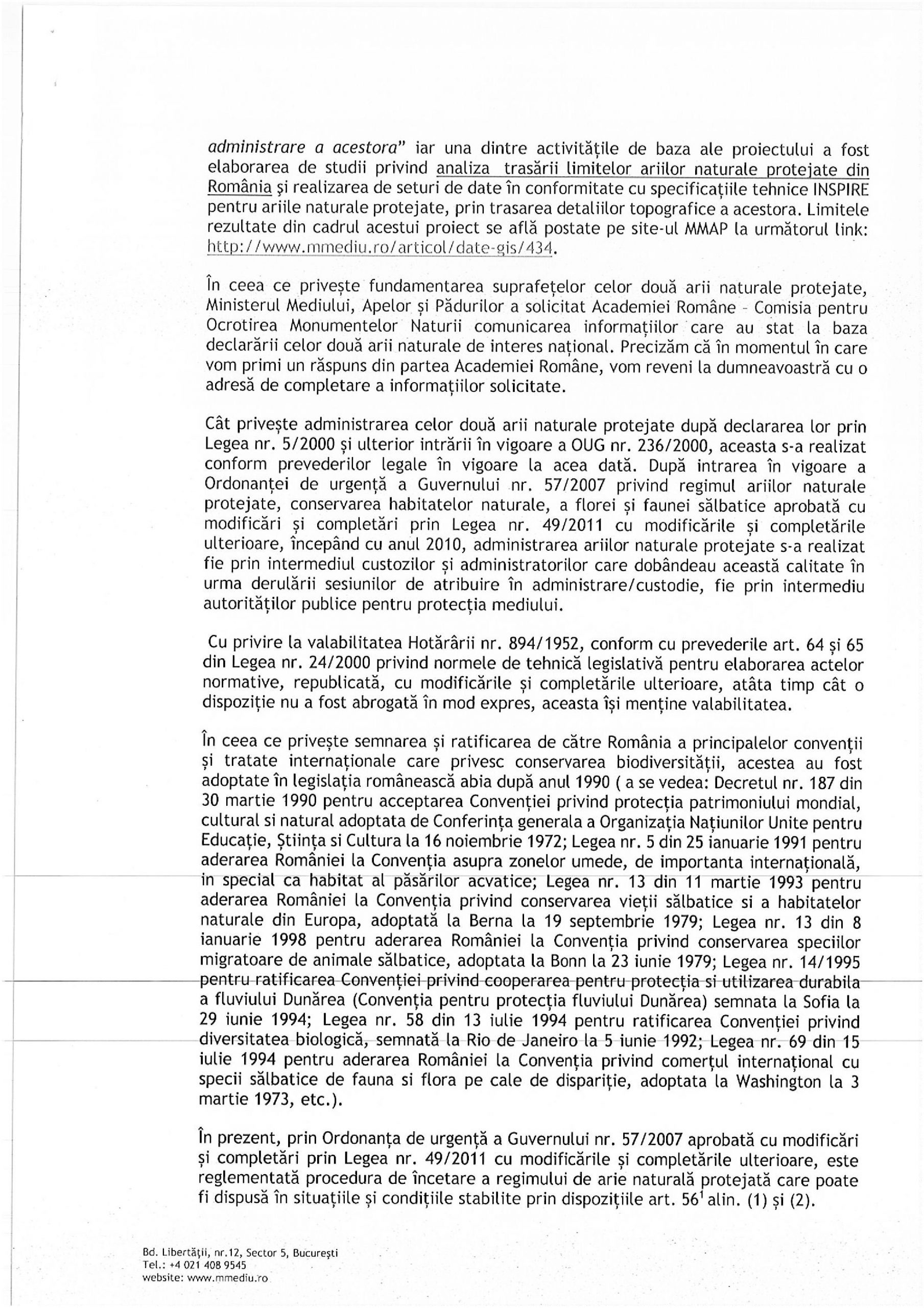 2) 07.01.202: răspunsul oficial al Ministerului Mediului (prin care confirmă ca si in prezent dpdv legal exista Rezervatia Naturala Snagov / ca obligatiile de conservare sunt incluse – implicit si in tratatele si conventiile internationale semnate de Romania in anii 199x / ca nu inteleg nici dansii cum de a putut fi “uitata” cu ocazia L5/2000 si ca au solicitat clarificari). Din corespondentele scrise (ulterioare) MM informeaza ca vor face toate demersurile a reactiva conservarea necesara (deci atat in baza legislatiei romanesti dar si a angajementelor prin 2 directive si mai multe conventii si tratate)